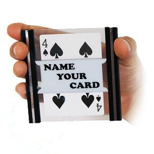 A card selected by the spectator appears in a transparent frame in seconds. Later it disappears from the frame and can be produced from the magician's pocket.