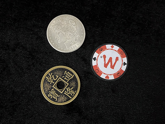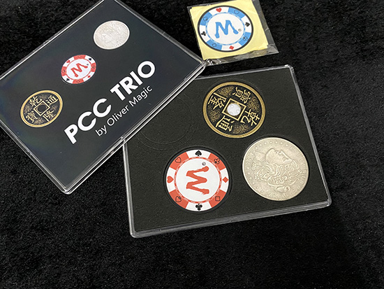 Various coins can be used in coin magic and the more representative are silver coins, copper coins, ancient coins and colorful chips, but most of the coin sets on the market are made of a single kind of coin. We got inspiration from the classic CSB coin set and selected three contrasting coins - morgan dollar, chinese ancient coin and chip to make up this PCC Trio.