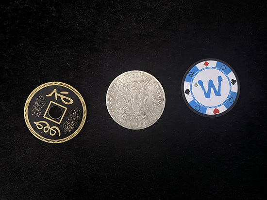 硬币魔术的表达总是千奇百怪。硬币魔术里最为代表的几种形制有银币 铜币 古币 以及彩色的筹码,我们在这些样子里挑出了三种反差最大的三款形制来完成这款道具。银币、古币还有筹码。